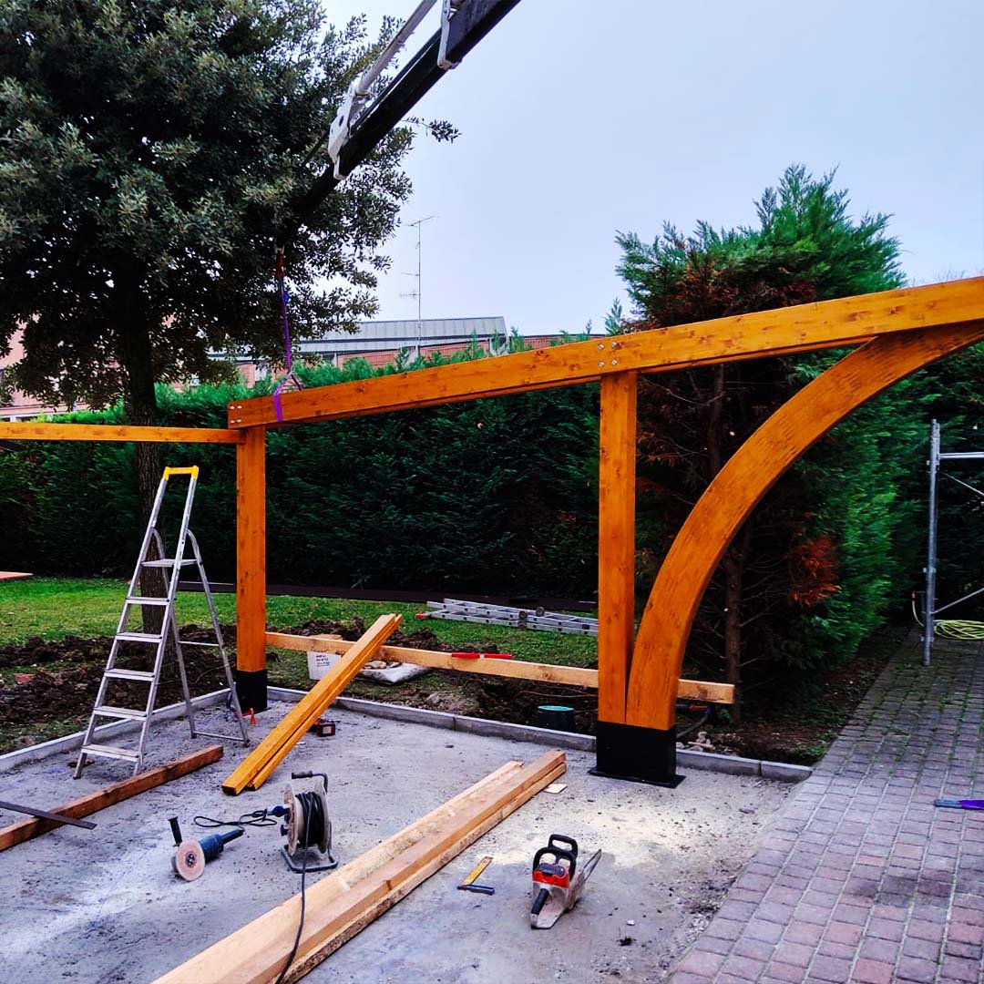 - Design Personalizzato: Dalle linee moderne e minimali alle strutture classiche con archi in legno lamellare. Possiamo integrare pannelli grigliati laterali per far crescere rampicanti o perlinati per maggiore privacy.