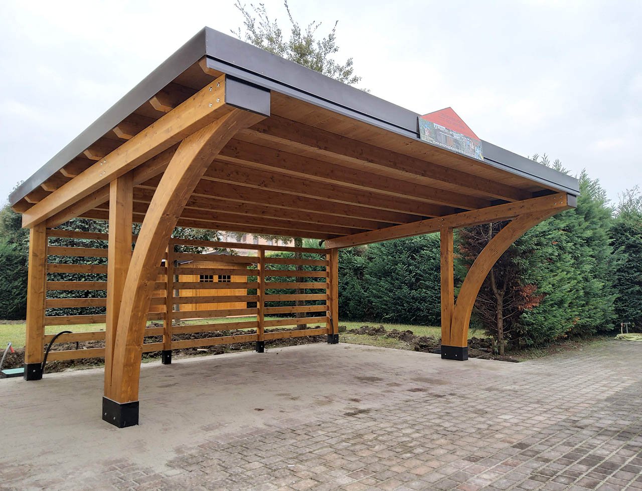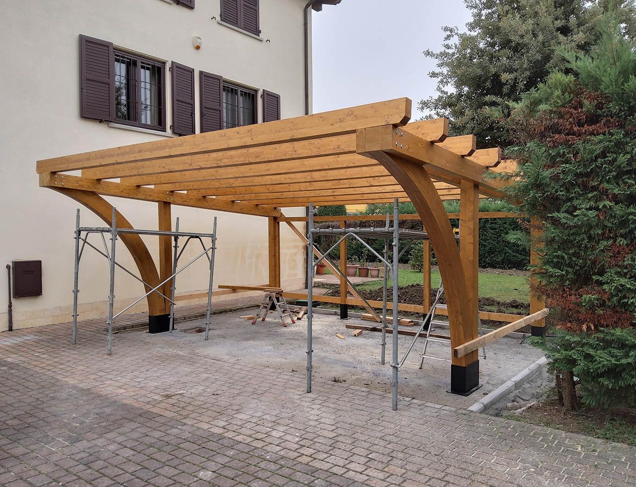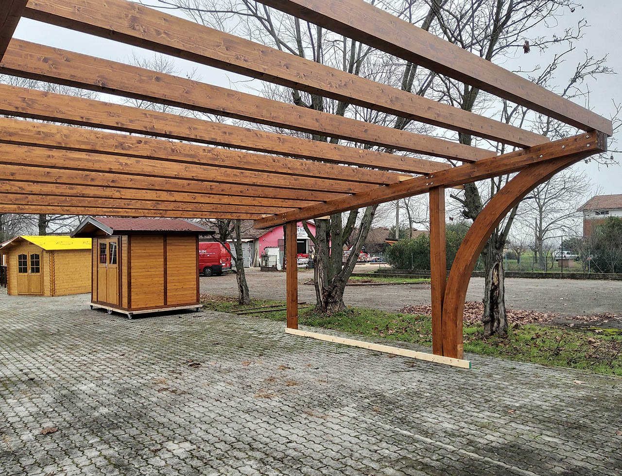 Grazie alla versatilità della materia prima, le nostre strutture si sposano con ogni stile: dal rustico al contemporaneo. Il legno lamellare che utilizziamo è trattato per resistere all'esterno, non teme l'umidità e trasforma un semplice "posto auto" in un elemento di valore per la tua proprietà.